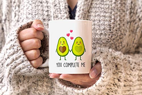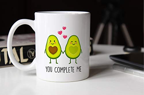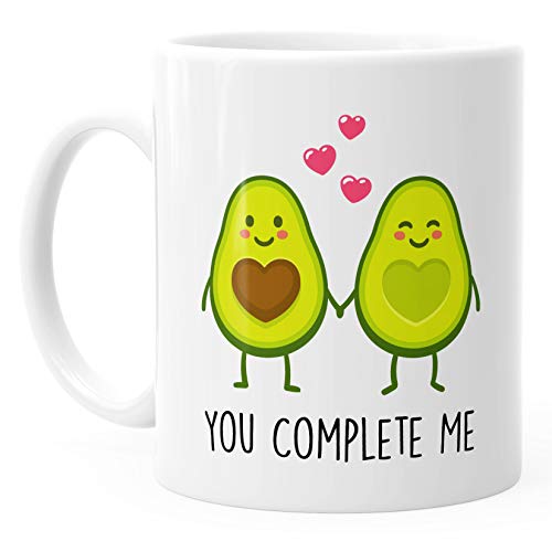 das perfekte Geschenk für deine besser Hälfte: liebevolle Geschenk-Tasse mit zwei verliebten Avocado-Hälften und „you complete me“ Schriftzug der Marke MoonWorks